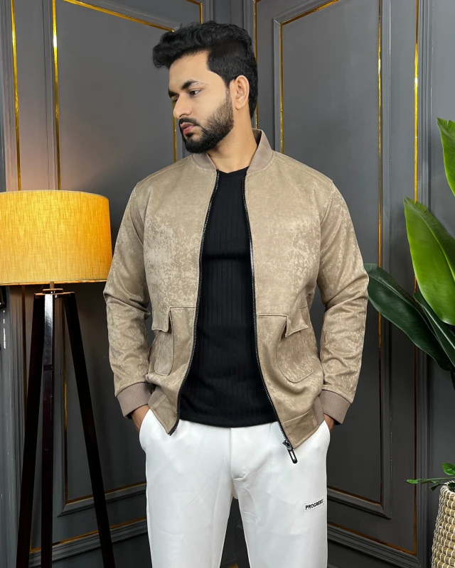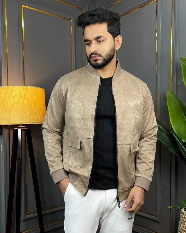 Premium Stylish Suede-Feel Zipper Bomber Jacket - Taupe Beige