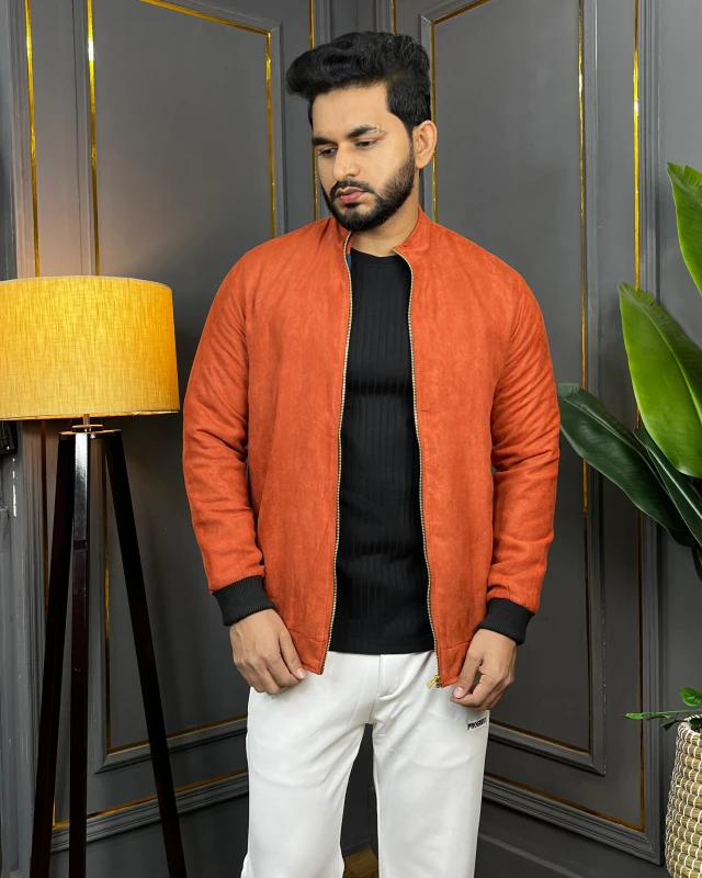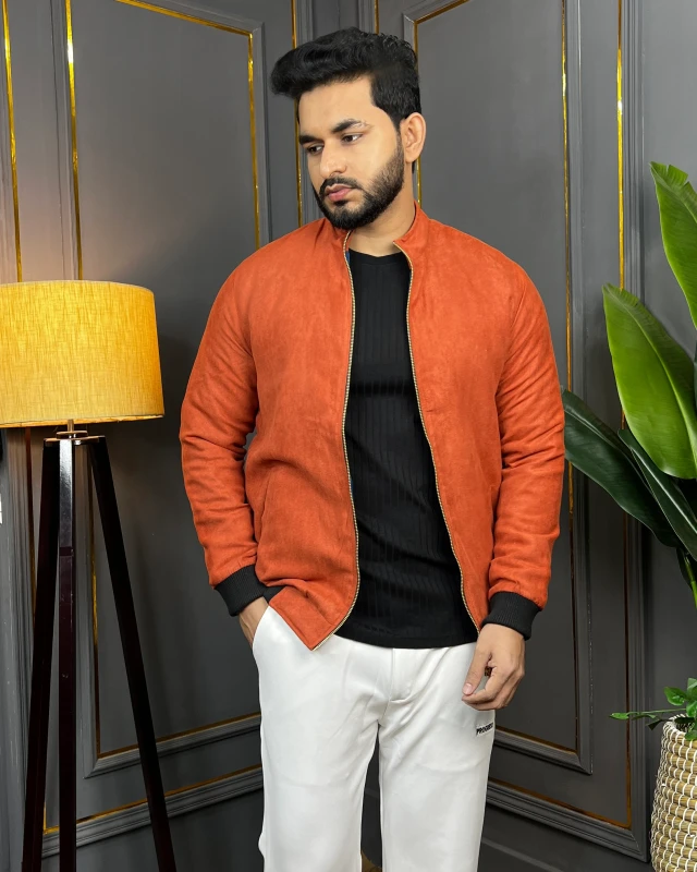 Designed with a full front zipper, ribbed cuffs, and dual utility pockets, it combines functionality with timeless style. The lightweight build ensures all-day comfort, while the rich burnt-red color adds a strong masculine statement to any outfit.