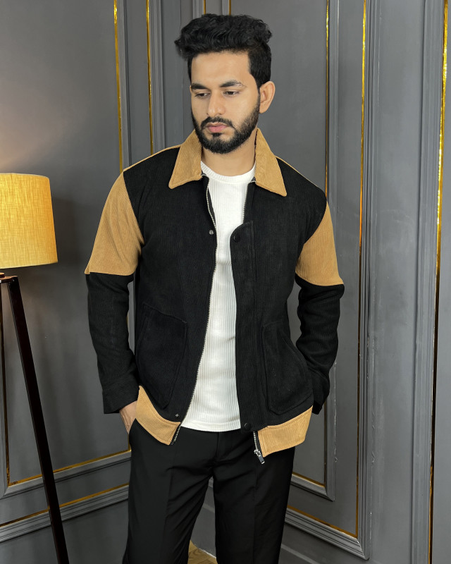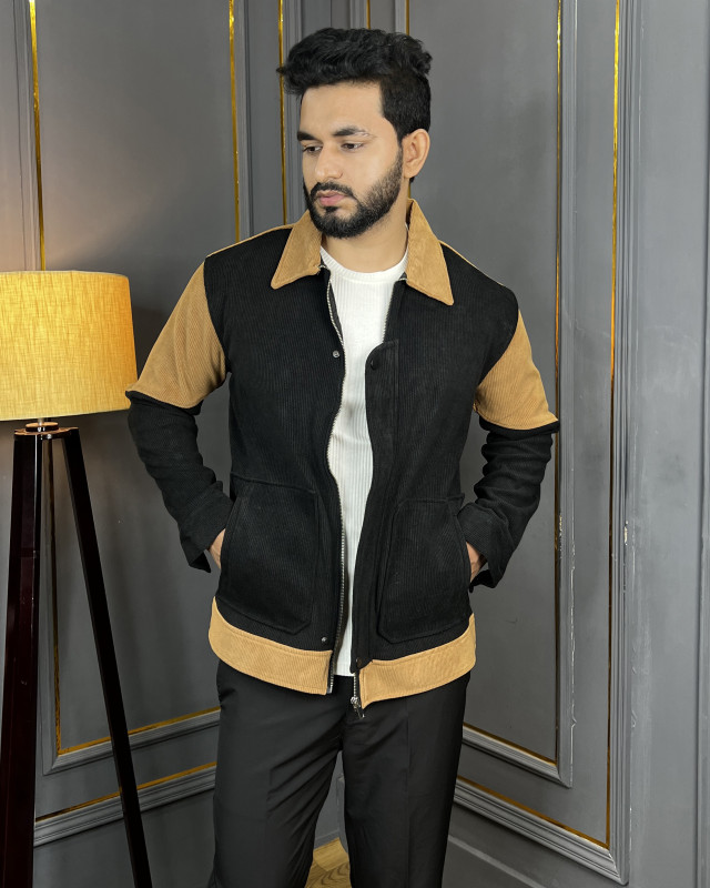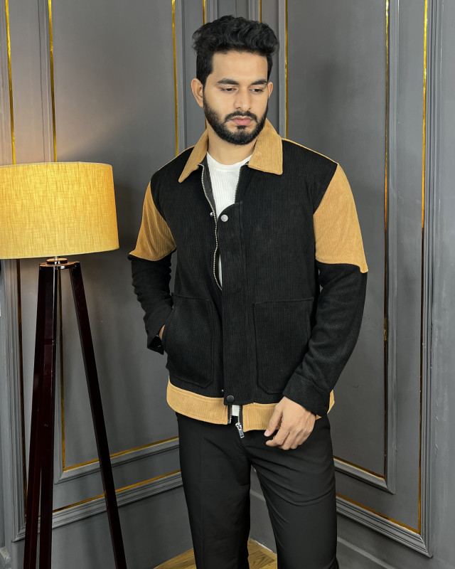 Premium Quality Contrast Corduroy Zipper Jacket - Black