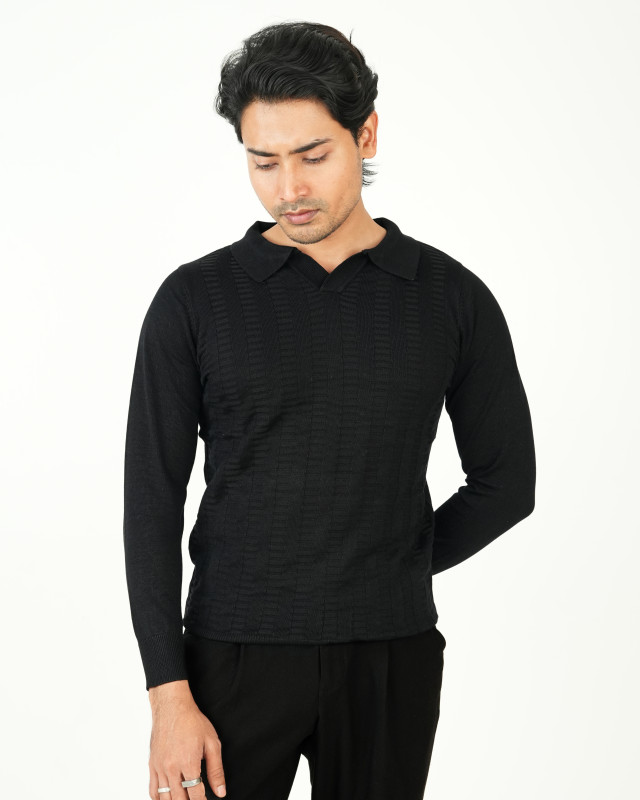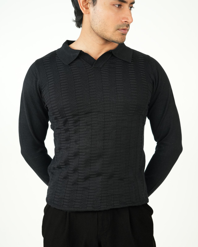 Premium Old Money Full Sleeve Textured Knit Polo - Black