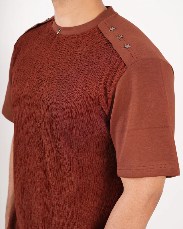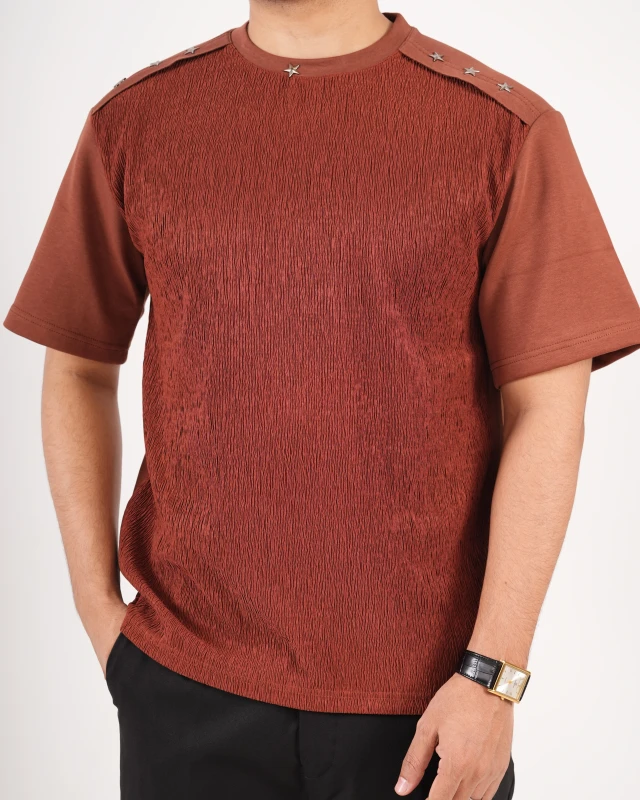 Elevate your everyday presence with a piece that speaks subtle luxury. This premium imported T-shirt is crafted with a unique textured fabric that adds depth, character, and a refined edge to your look. The rich earthy tone brings a bold yet sophisticated vibe—perfect for men who prefer quiet confidence over loud fashion.