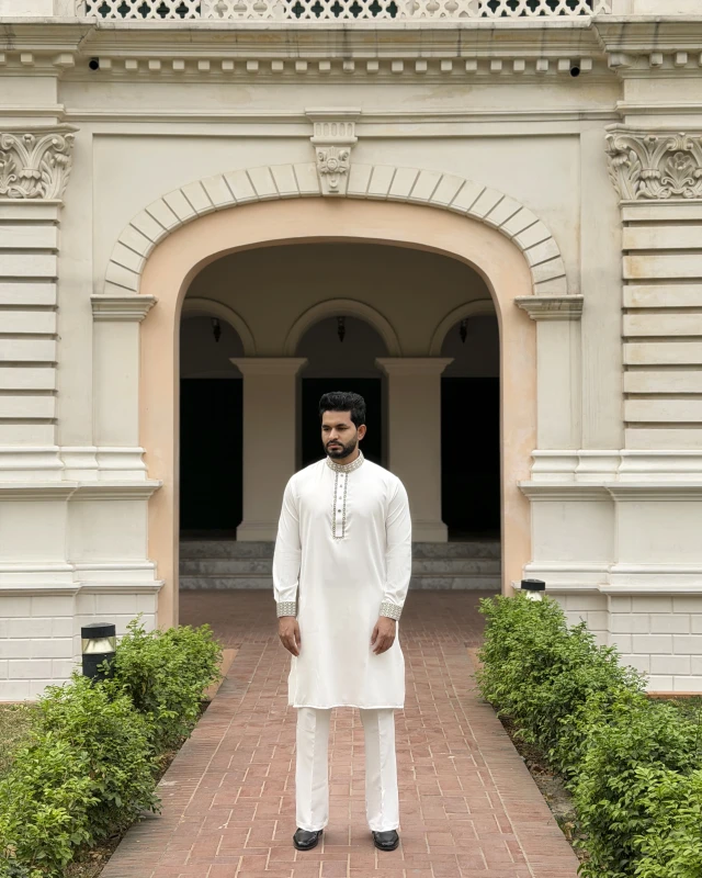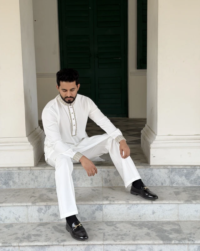 Tailored for comfort and a clean, elegant silhouette, this piece ensures you look effortlessly polished at every Eid gathering.