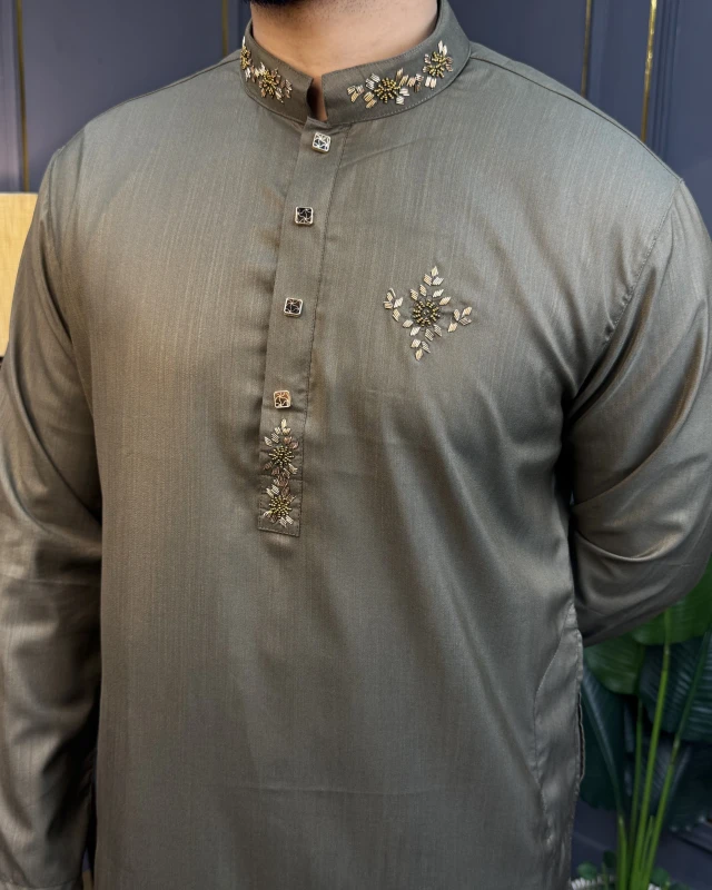 What sets this panjabi apart is the handcrafted Karchupi and Zardozi detailing carefully placed along the collar, placket, and chest motif. Metallic threads and subtle bead accents create a refined shimmer — not loud, but powerful enough to reflect elegance and heritage in every movement.