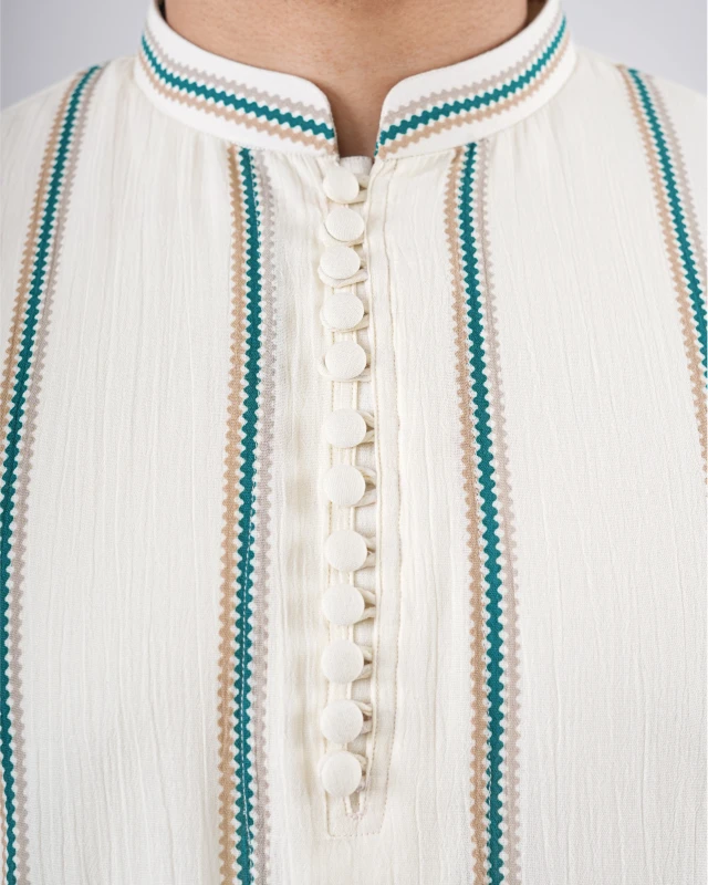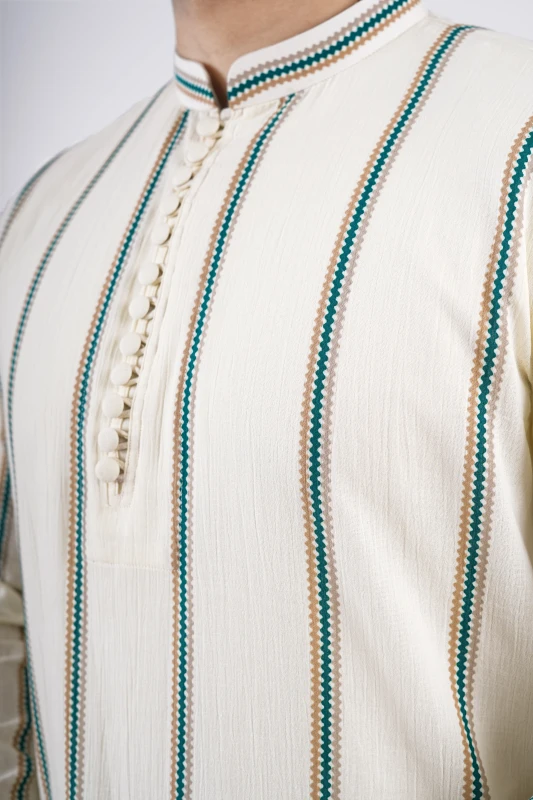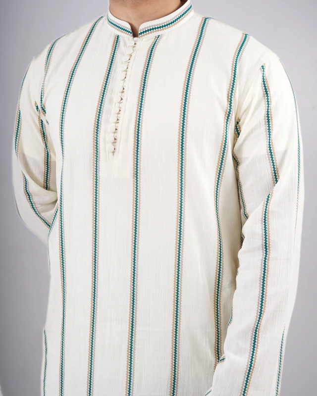 Designed for timeless festive elegance, this premium panjabi features a sophisticated ivory base elevated by subtle vertical detailing. A perfect balance of tradition and modern class — made for men who prefer understated luxury.